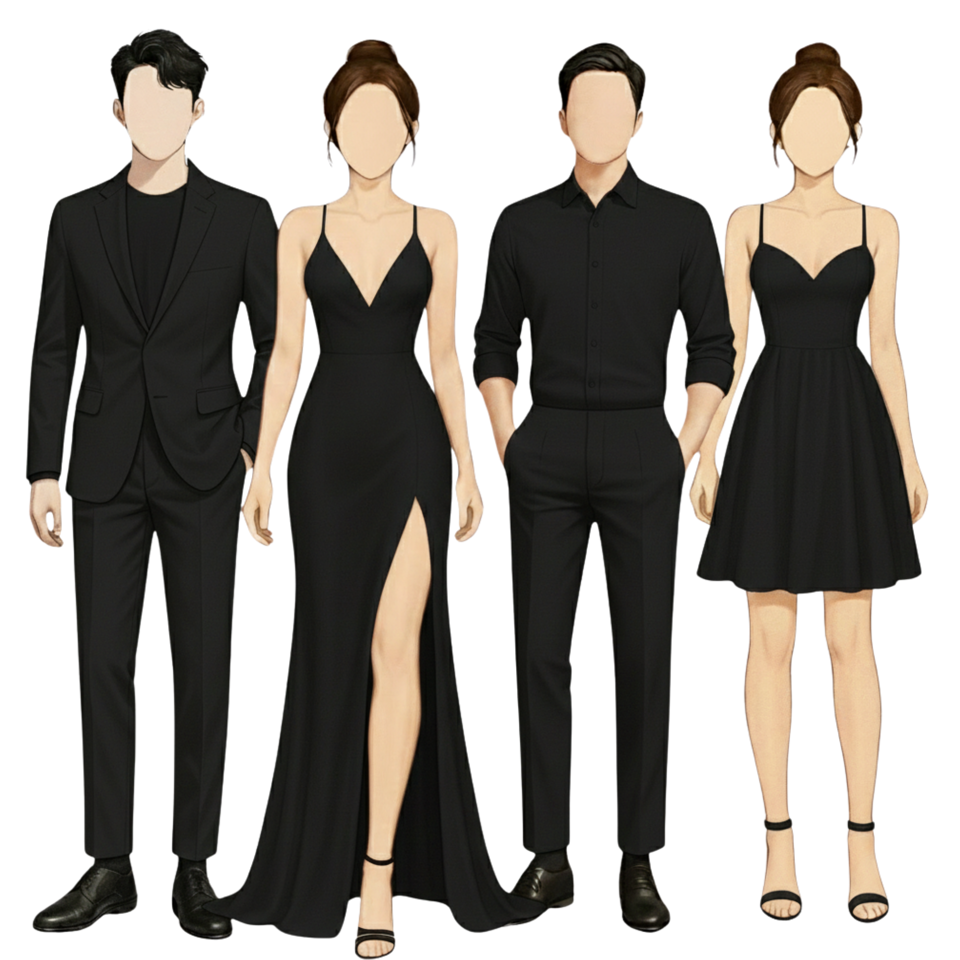 ladies: Formal wear, cocktail dress or long evening gown gentlemen: black formal suit or long sleeves
