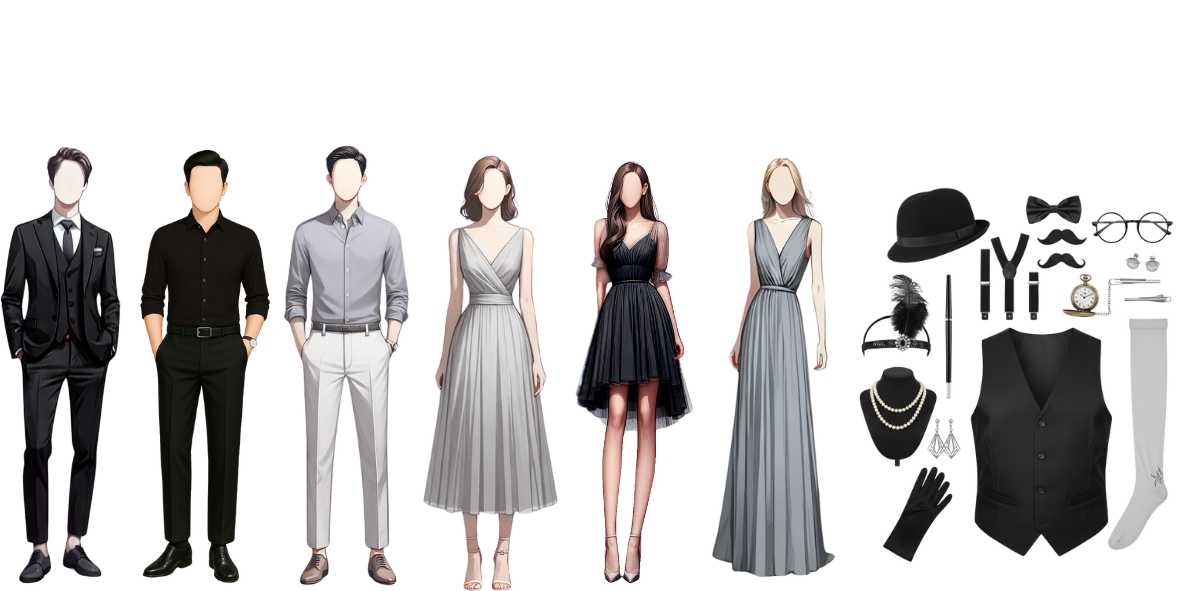 Dinner jackets, cardigans, polos, & vests would also be great. Think "cocktail party"! Suits for gentlemen and cocktail dresses for ladies are perfect.
