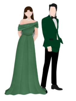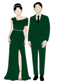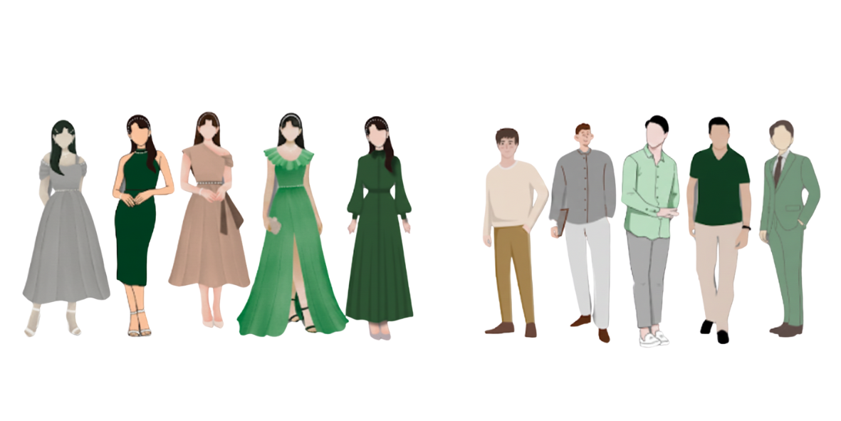 We would love to see you in your SEMI-FORMAL or FORMAL ATTIRE. Please dress according to our wedding motif. (Color palette shown: Dark Green, Emerald Green, Sage Green, Champagne/Tan, and Silver/Grey)
